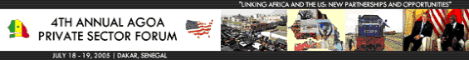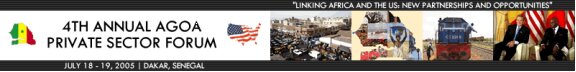 The Corporate Council on Africa was proud to co-chair the Fourth Annual AGOA Private Sector Forum in Dakar, Senegal, July 18-19, 2005. CCA was joined by its private sector co-chairs, the African Business Roundtable and APIX, Senegal. The Whitaker Group, of Washington, DC, served as Private Sector Forum Secretariat as well as co-chair for the forum. In line with tradition, the Private Sector Forum was held in conjunction with the Ministerial Forum, headed by the United States and Senegalese governments. The 2005 Forum was the first AGOA Forum to provide Private Sector and Ministerial participants the opportunity to interact directly in the respective workshop settings.